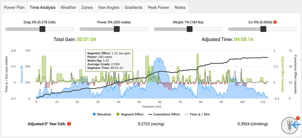 The Time Analysis tool allows you to view the estimated time difference for changes in Power, Weight and/or Drag for the race at both the individual segment level as well as the total cumulative time difference. Here are just a few things you could do with the Time Analysis feature.